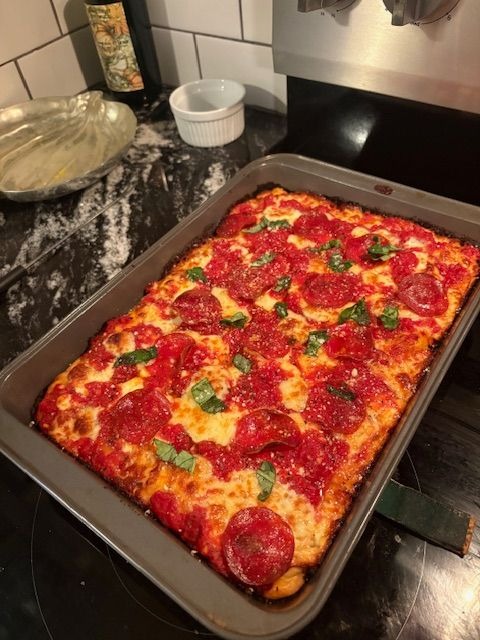 I start from scratch. Homemade dough, homemade sauce, and I personalize each pizza for the people who will be eating it. I’ve experimented with different styles along the way: Detroit-style, thin crust, and a few variations in between. Most of them turn out pretty well. And, like anything worthwhile, they’ve gotten better over time. I really enjoy the process.